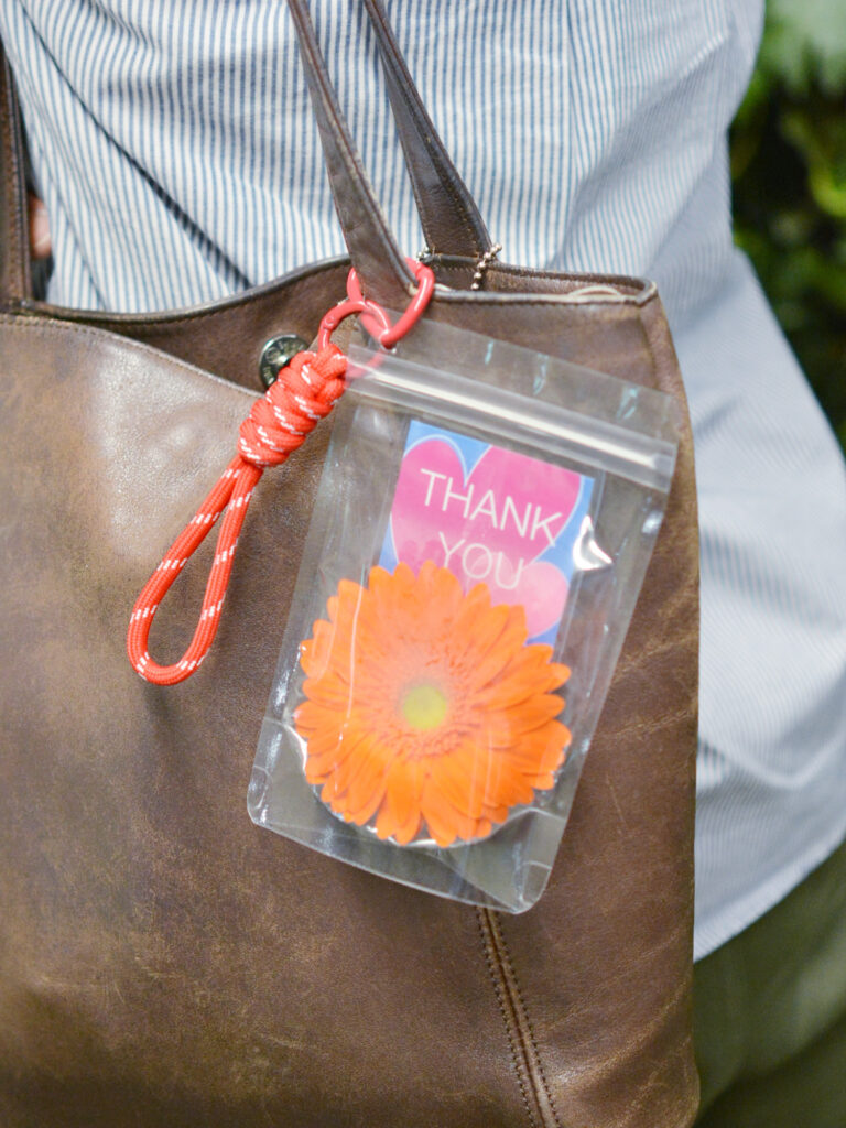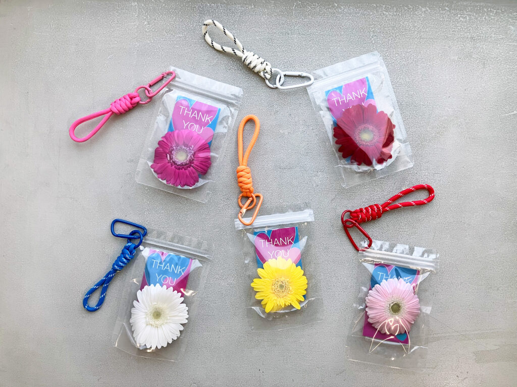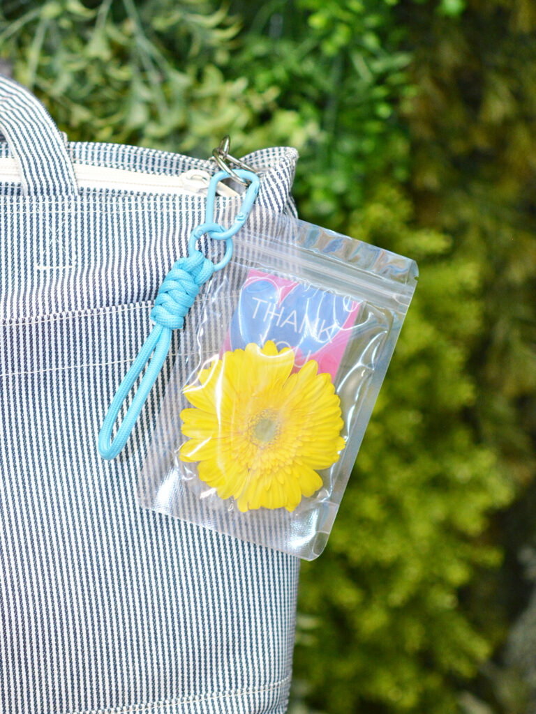 バッグや衣服、スマホなどに簡単に装着できるカラビナ付きストラップが付属。花色やその日の気分に合わせてカラビナ付きストラップとの色の組み合わせを自由に楽しめる。