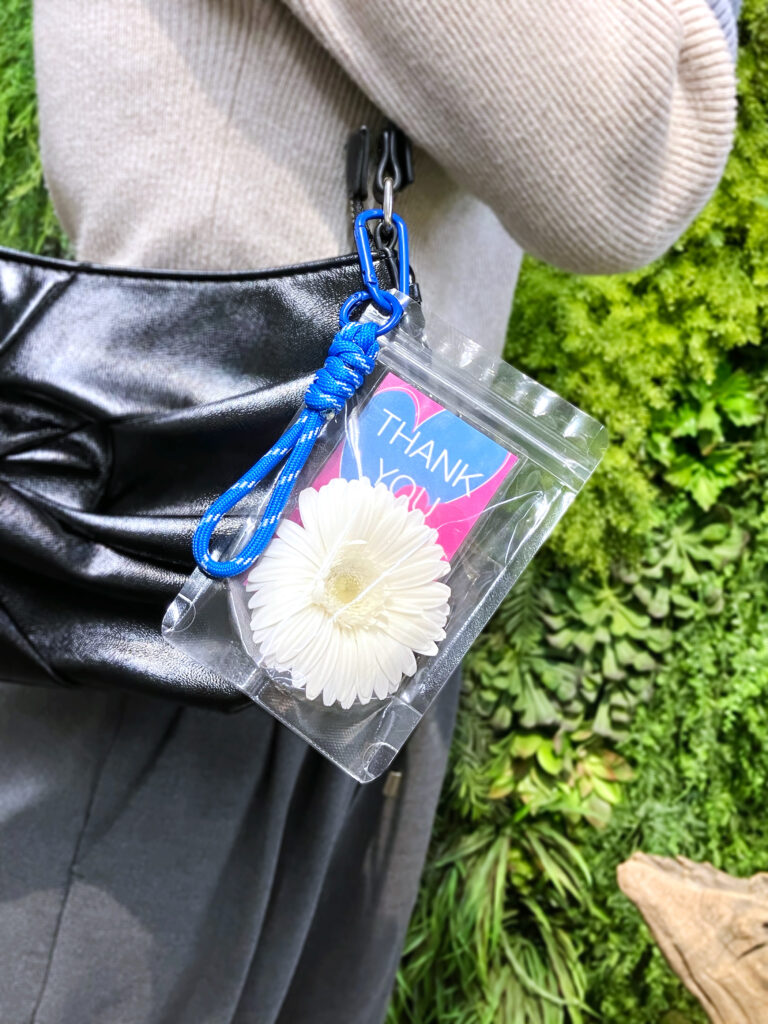 生花をキーホルダーやチャームのようにバッグや衣服に装着して持ち歩ける新商品「pokehana(ポケハナ)」。独自のパッケージにより、水やり不要で生花の鮮やかな色彩を、アクセサリーのように日常のコーディネートへ取り入れる、新しい花体験を提案します。